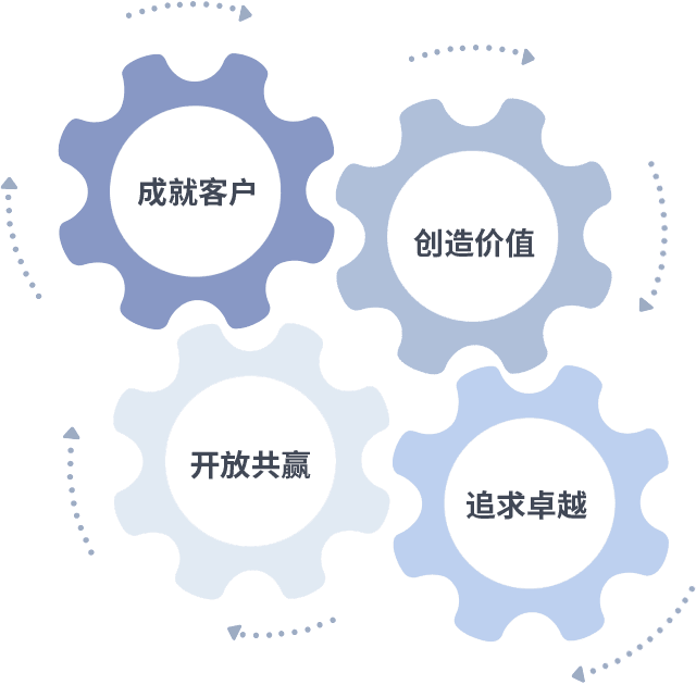 成就客户是一切决策的出发点,,,,创造价值是衡量所有工作的标准,,,,追求卓越是我们做事做人的态度,,,,开放共赢是我们的格局也是最终的结果。。。价值观的齿轮环环相扣,,推动着组织里的每个人不断向前。。。。